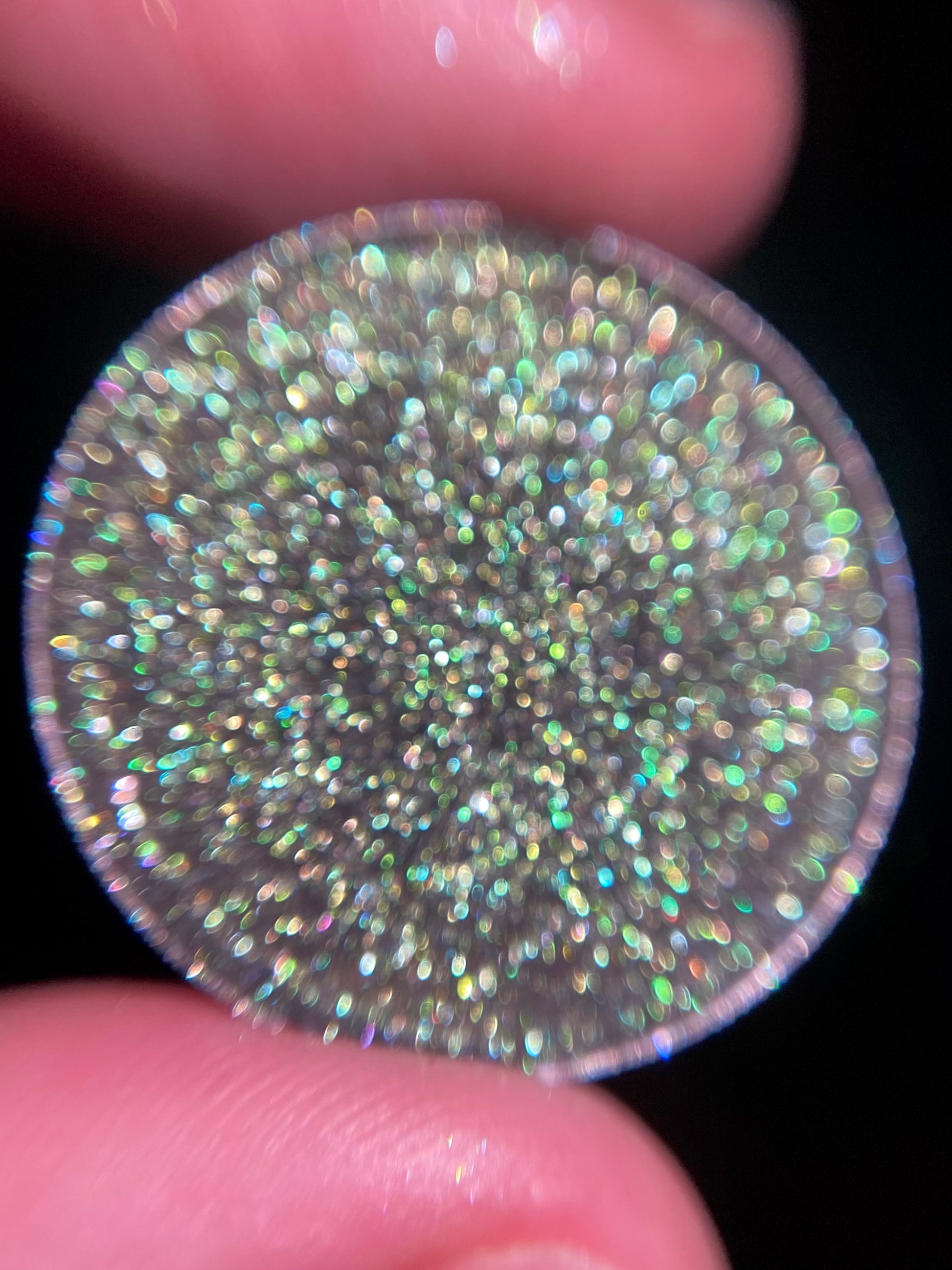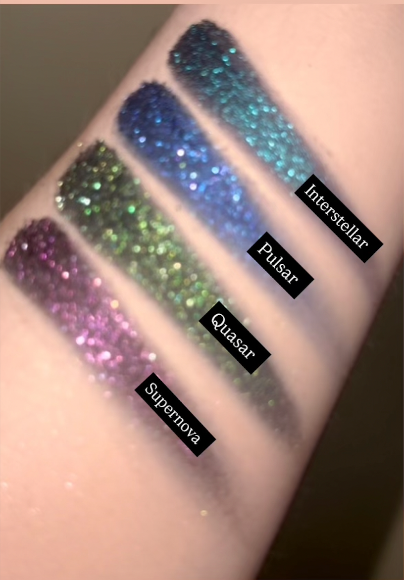 Quasar is a brilliant green, sparkly multichrome with a black base. This shade is inspired by quasars, which are the cores of galaxies that are powered by super massive black holes. Quasars are highly luminous, and often outshine their own galaxy.