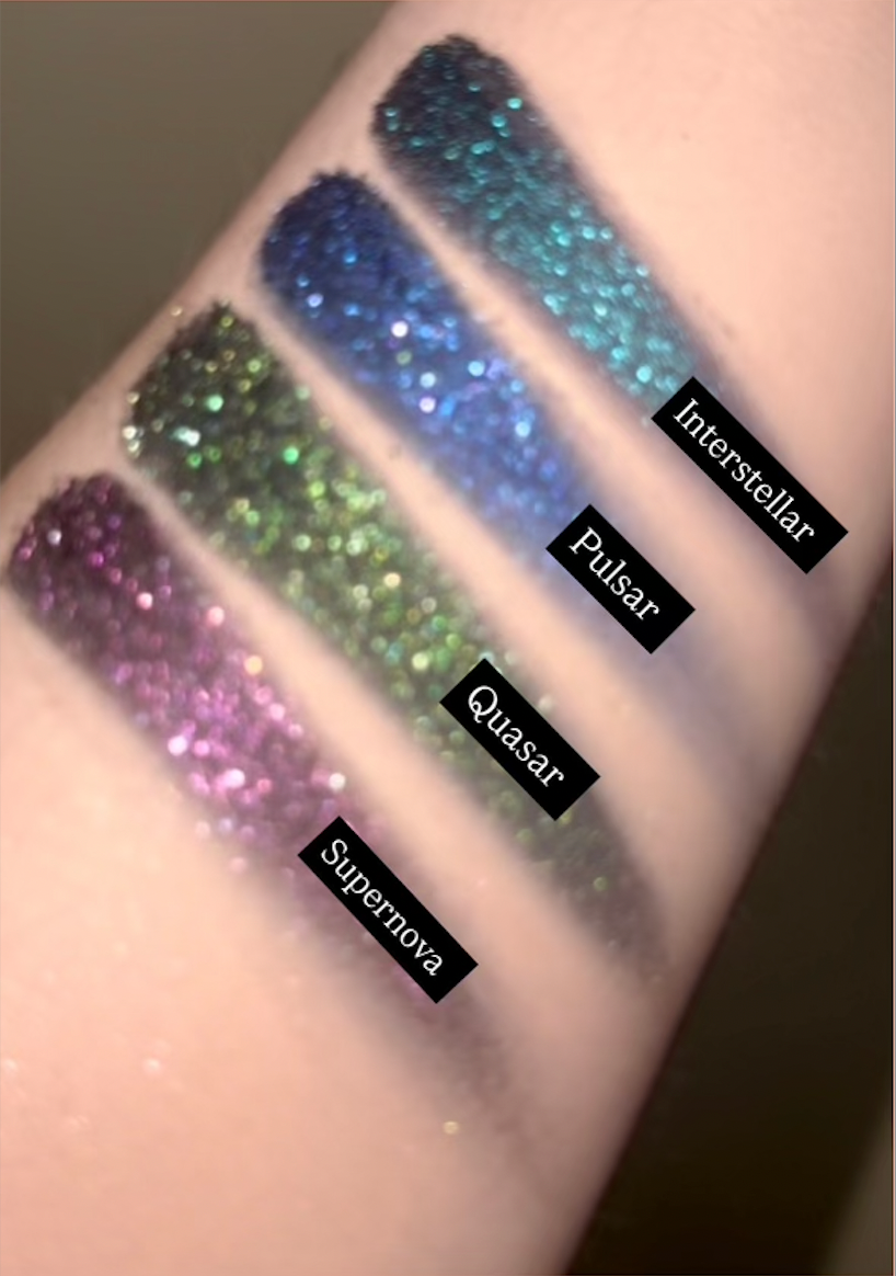 Supernova is a sparkly red/pink multichrome eyeshadow with a black base, and it is inspired by a giant explosion that marks a star death. Supernovas are incredibly significant because as a star explodes, many elements that are the building blocks of our universe are released.